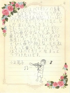 さいしょは、男が一人、ぼくだけなので、「遊ぶ人がいないなぁ。」と思っていたけど、いったら楽しかった。どうゆうのが楽しかったというと、みんなで、バイオリンをひいたり、先生がいない時に、みんなでゲームで遊んだりしたことが楽し […]